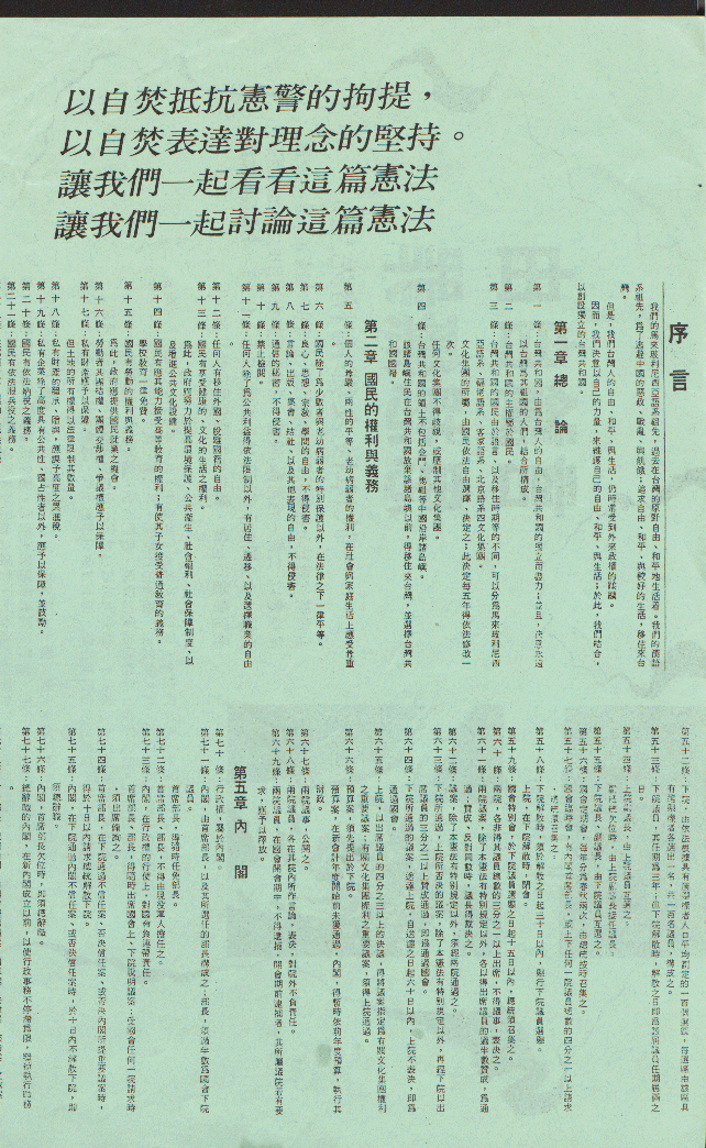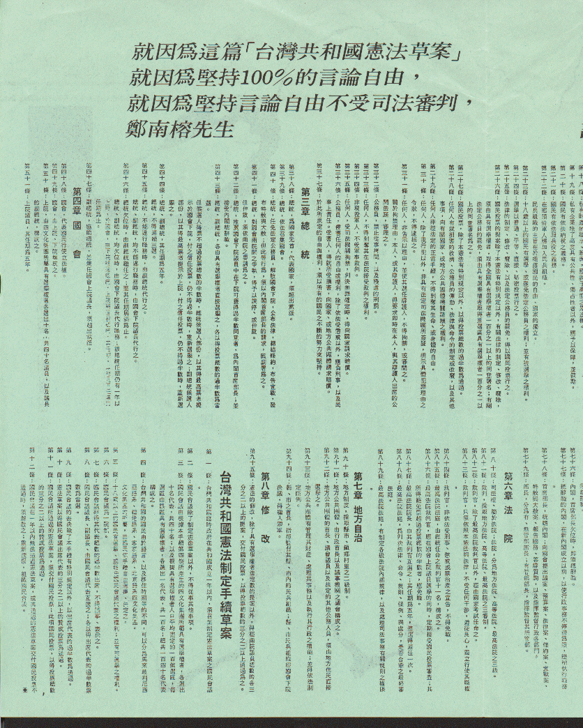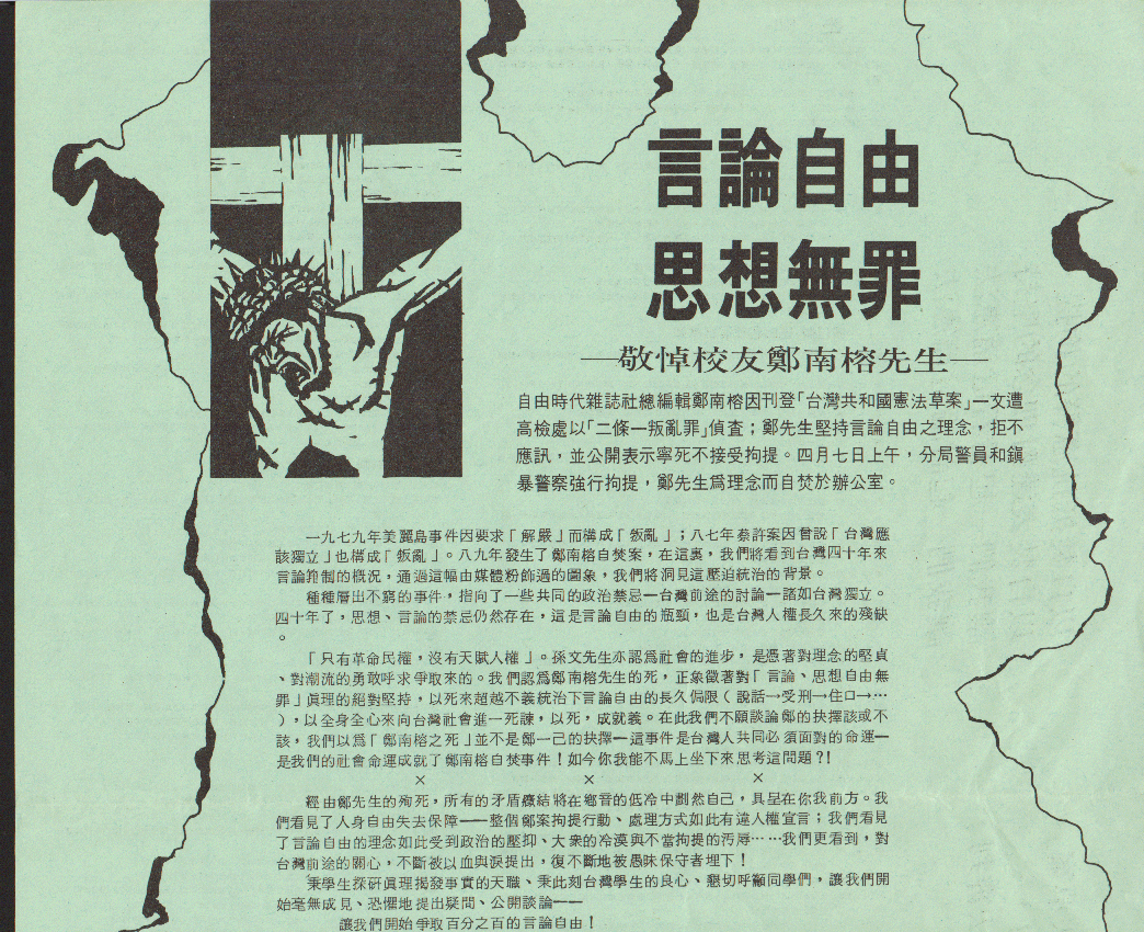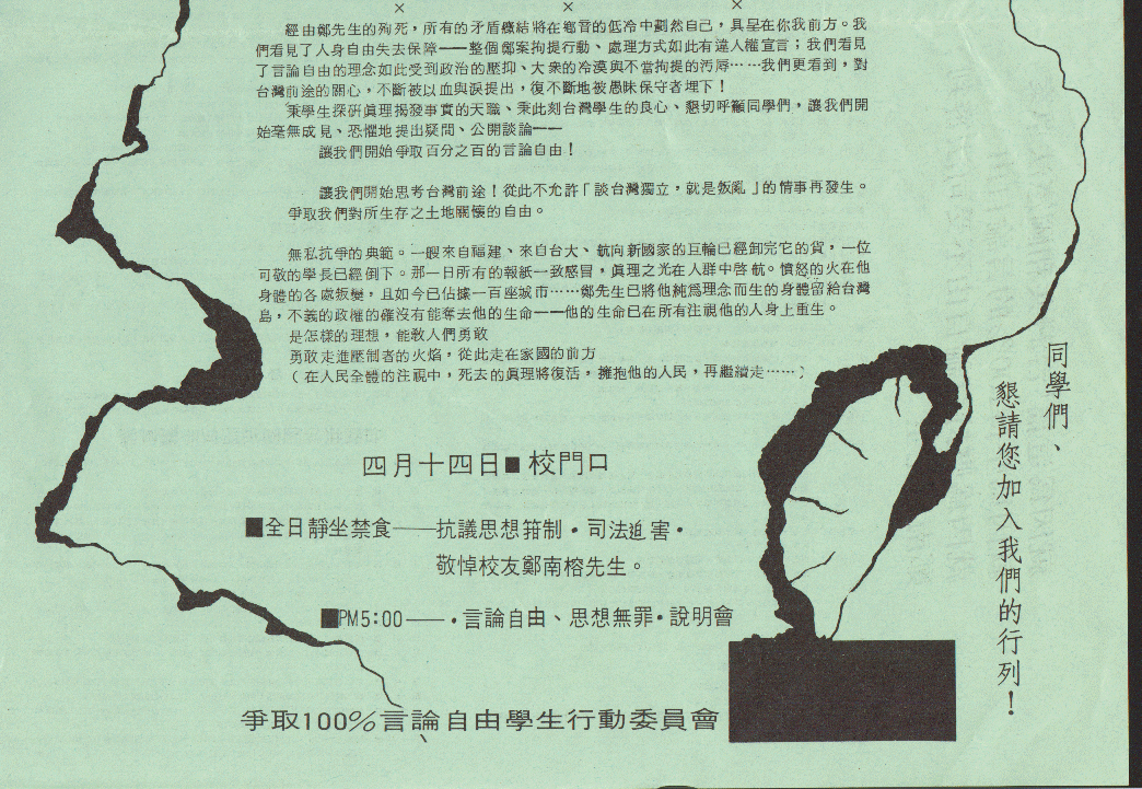 阿張蘭石, 1994:《自由之愛--無名詩人革命詩集》卷二<無名詩經>(七篇之四)“[學運中的傳單]爭取言論自由敬悼鄭南榕”,台大心靈悲智學社。